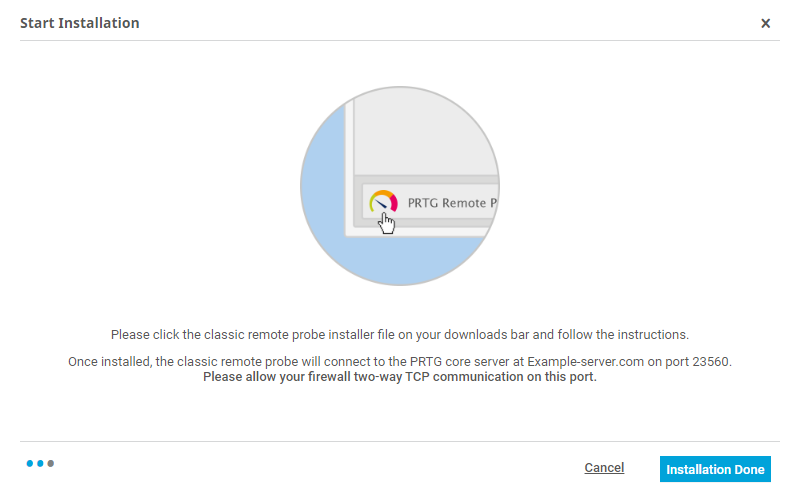 In the installation approach with the assistant, PRTG guides you through the installation process. If you Download the Classic Remote Probe Installer directly, you must install the classic remote probe without the assistant.