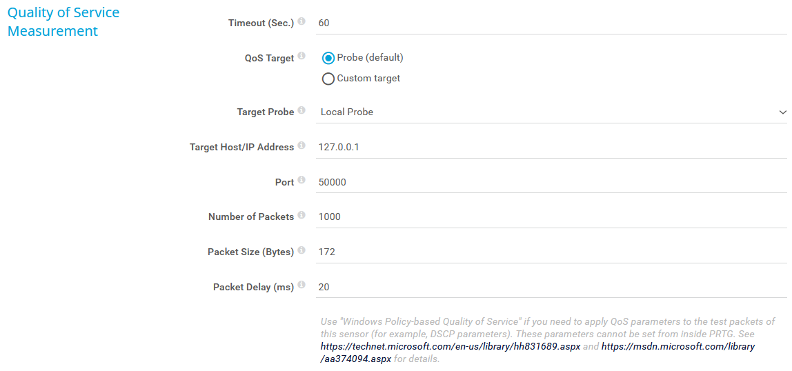 This sensor requires that you configure at least one classic remote probe in your PRTG Network Monitor setup and at least two classic remote probes in PRTG Hosted Monitor, or you must set up the PRTG QoS Reflector tool on the target system at the endpoint of the connection that you want to monitor.