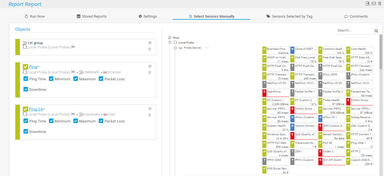 Click the Select Sensors Manually tab to manually add sensors that you want to include in the report.
