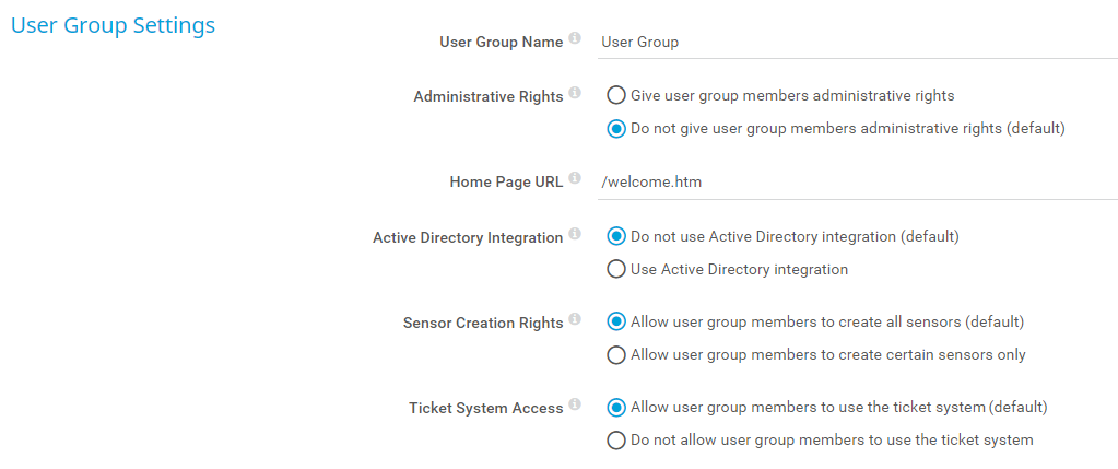 Define the default home page for the user group members. This is the page that the user sees after logging in or when selecting Home from the main menu. Enter a PRTG-internal web page.